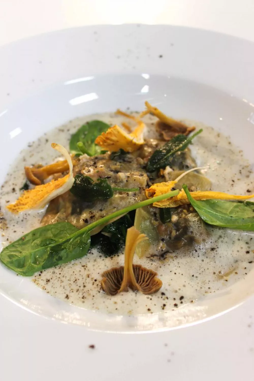 Schep de gestoofde spinazie in een bordje, schik de ravioli’s er mooi bovenop. Overgiet met de bouillon van champingons en werk af met enkele blaadjes gefrituurde salie.