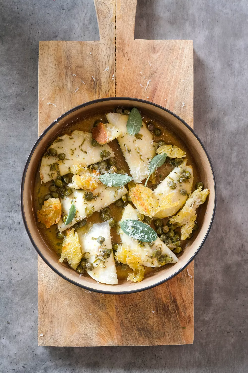 Smelt een flinke klont boter in een pannetje op het vuur. Voeg een beetje zeste van citroen, sap van citroen, kappertjes en salie toe. Kruid met peper.