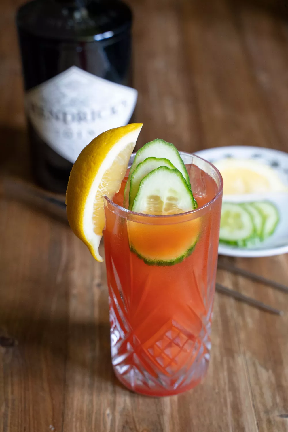 Giet de cocktail in het gekoelde cocktailglas en garneer met drie dunne schijfjes komkommer en een partje citroen.