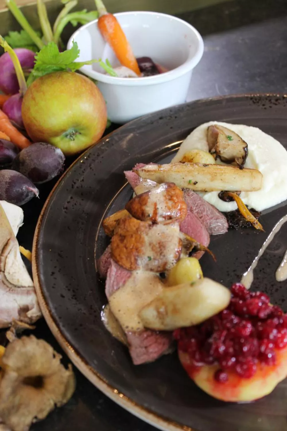 Een elegante reebout met fluweelzachte knolselderpuree en een aromatische truffelbouillon, ideaal voor een herfstig of feestelijk diner. Het vlees krijgt een knapperig korstje in de pan en wordt kort verder gegaard in de oven, gecombineerd met gekarameliseerde appeltjes, boschampignons en goudbruine aardappelbolletjes. Afgewerkt met romige wildsaus en frisse veenbessen voor een verfijnde smaakbalans.