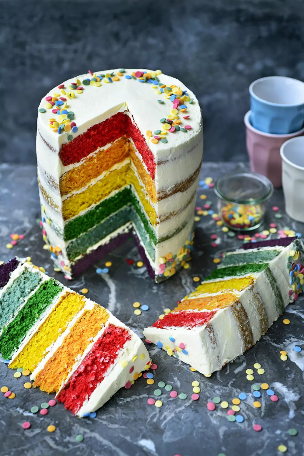 Deze vrolijke regenboogcake met amandelpoeder en romige vanillebotercrème is ideaal voor verjaardagen, een lentefeestje of als kleurrijke showstopper op elk etentje. Luchtige cakelaagjes van eieren, zonnebloemolie en zelfrijzende bloem worden apart gekleurd en gestapeld voor een spectaculair aansnijdmoment. Met eenvoudige baktips en een dunne naked afwerking maak je een feestelijke taart boordevol kleur en smaak.