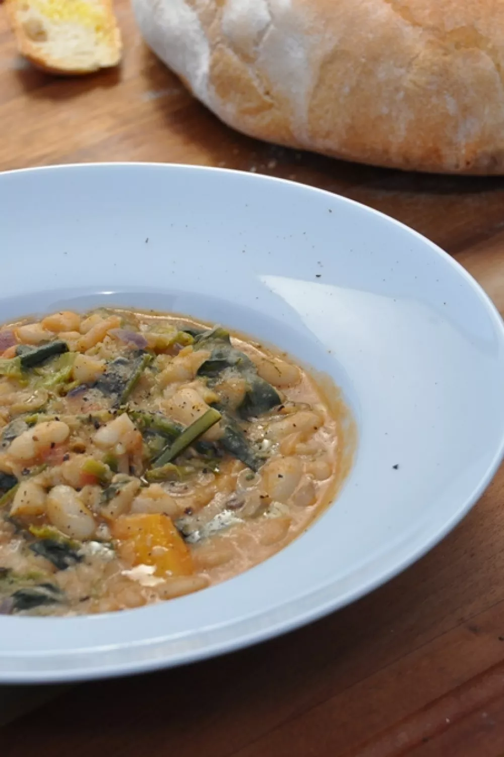 Ribollita is een rustieke Toscaanse groentesoep met zachte cannellinibonen en stevige bladgroenten zoals cavolo nero en snijbiet. Langzaam gestoofde selder, wortel en aardappel krijgen diepte dankzij gepureerde bonen en tomatenpulp, terwijl gegrild zoutloos brood voor een hartige textuur zorgt. Perfect als winterse comfort food of een stevige vegetarische lunch vol Italiaanse smaken.