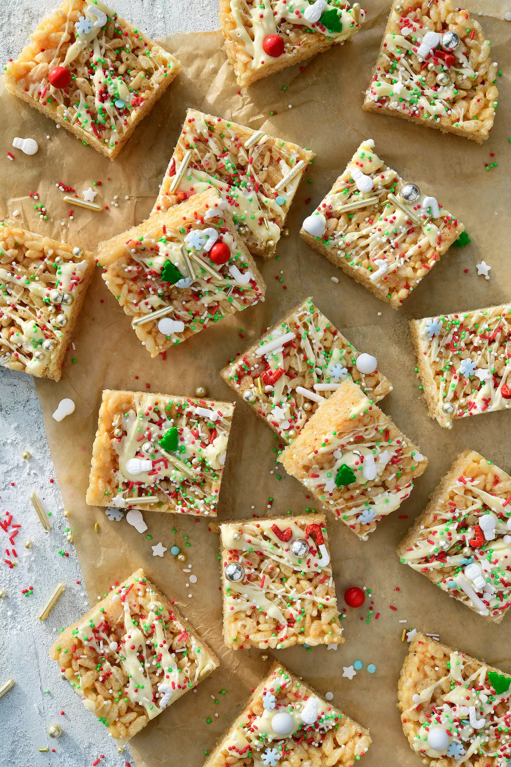 Plakkerige zoete Rice Krispies traktatie met marshmallows en witte chocolade, ideaal voor gezellige kersttaferelen of een feestelijke snack. In enkele simpele stappen smelt je boter en marshmallows, meng je ze met krokante Rice Krispies en druk je het mengsel in een springvorm, waarna je royaal witte chocolade en kerstsprinkles strooit. Een vrolijke winterse traktatie die je zonder te bakken maakt en makkelijk in 16 vierkantjes snijdt en bewaart.