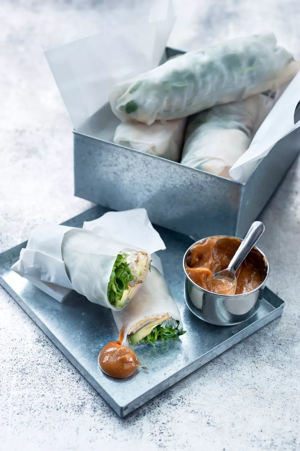 Serveer de rice rolls samen met de dipsaus.