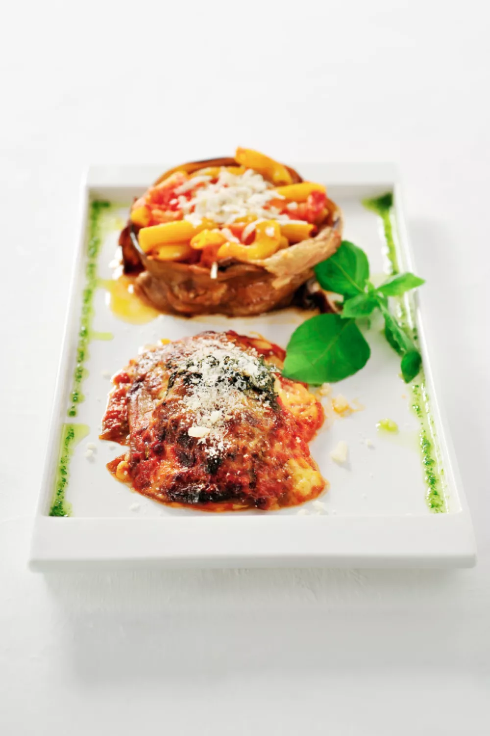 Schep de aubergine met parmezaan ernaast en werk af met een blaadje basilicum. Besprenkel met olijfolie en gemalen peper.