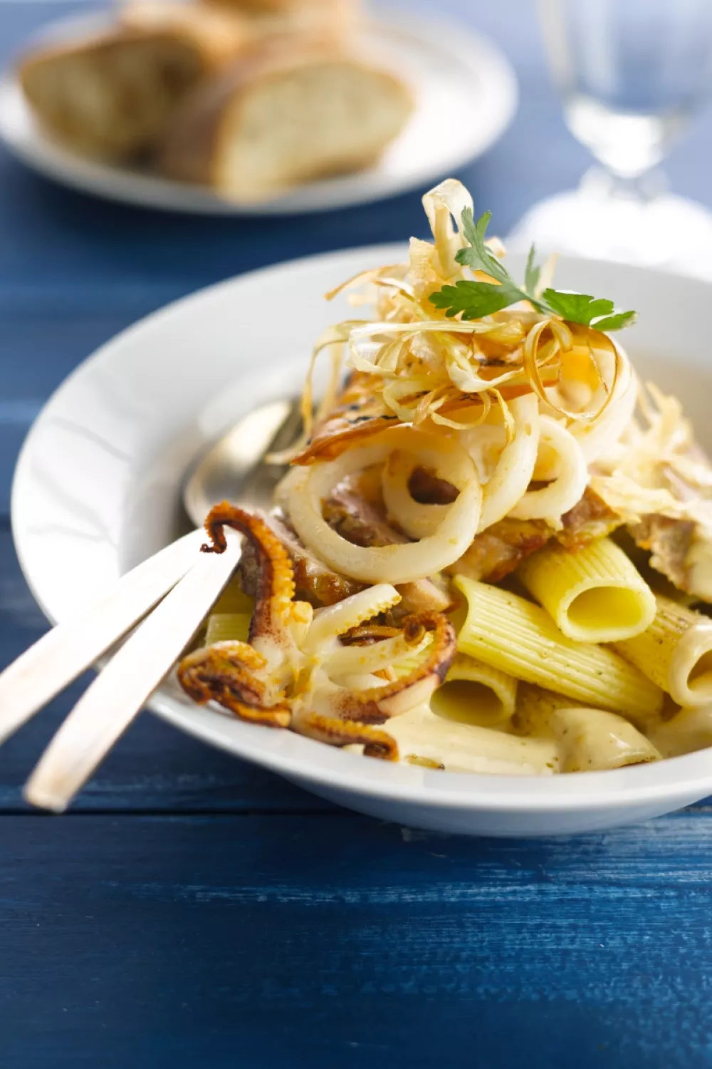 Kook ondertussen de rigatoni al dente in een grote hoeveelheid gezouten water. Giet af en besprenkel met wat olijfolie. Draai er wat peper van de molen over. Bak de inktvisjes heel kort in olijfolie in een pan met Teflonlaag. Kruid met peper van de molen en zout.