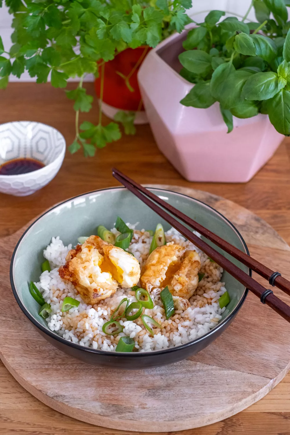 Deze rijst met gefrituurde eieren serveert knapperige, goudbruine eieren met een zacht, romig hart dankzij de slimme truc om de rauwe eieren kort te bevriezen en vervolgens te paneren en frituren. Combineer met warme gekookte rijst, fijngesneden lente-ui en een scheut sojasaus of teriyakisaus voor een hartige Aziatische toets. Perfect als snel comfortfood voor doordeweeks of als verrassend streetfood bij een gezellige maaltijd.