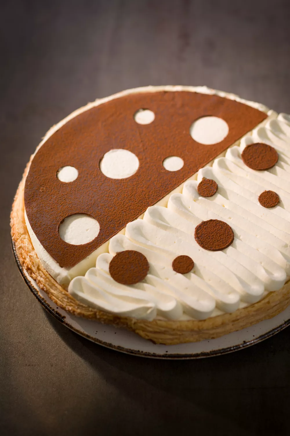 Bestrooi met behulp van een zeefje de halve chocoladecirkel met gaten en de losse chocoladecirkels met een dun laagje cacao. Leg de halve cirkel op de gladde helft van de vlaai en verdeel de kleine cirkels op de slagroom in zigzagpatroon.