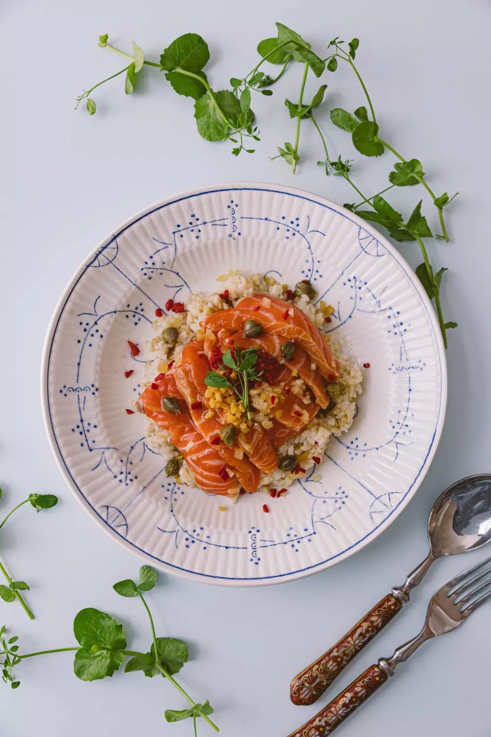 Snijd de zalm in hapklare stukken. Versnipper de ui. Maak het pekelwater door de ingrediënten te mengen en breng het aan de kook. Laat het afkoelen. Neem een weckpot, leg er de ui, kappertjes en zalm in, en giet er het pekelwater bij. Voeg de chilipeper toe. Laat minimaal 4 uur marineren alvorens te serveren als topping bij de rijstbowl.