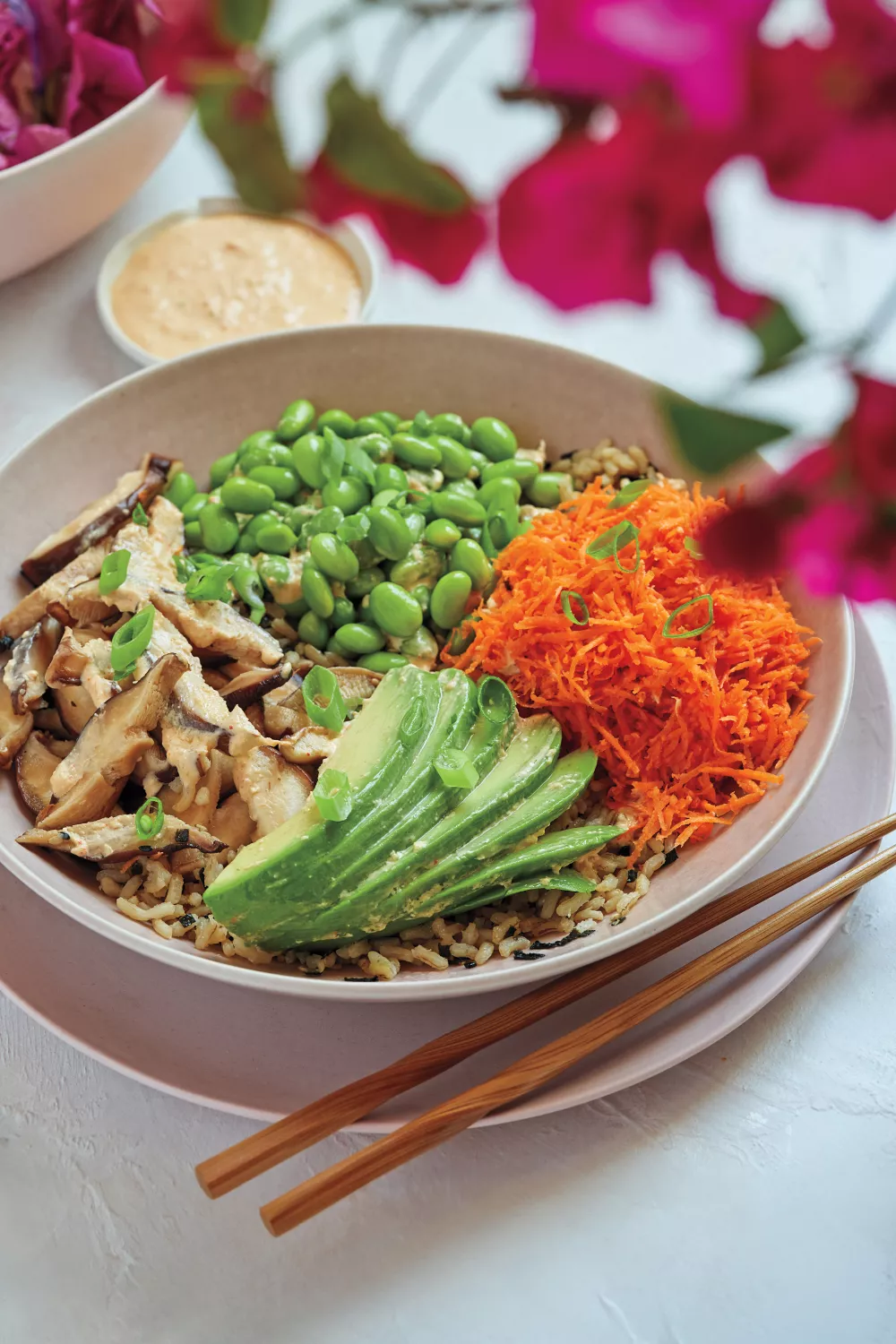 Verdeel hierover de edamame, wortel, avocado en shiitakes en sprenkel de dressing erover. Garneer met de lente-uitjes.