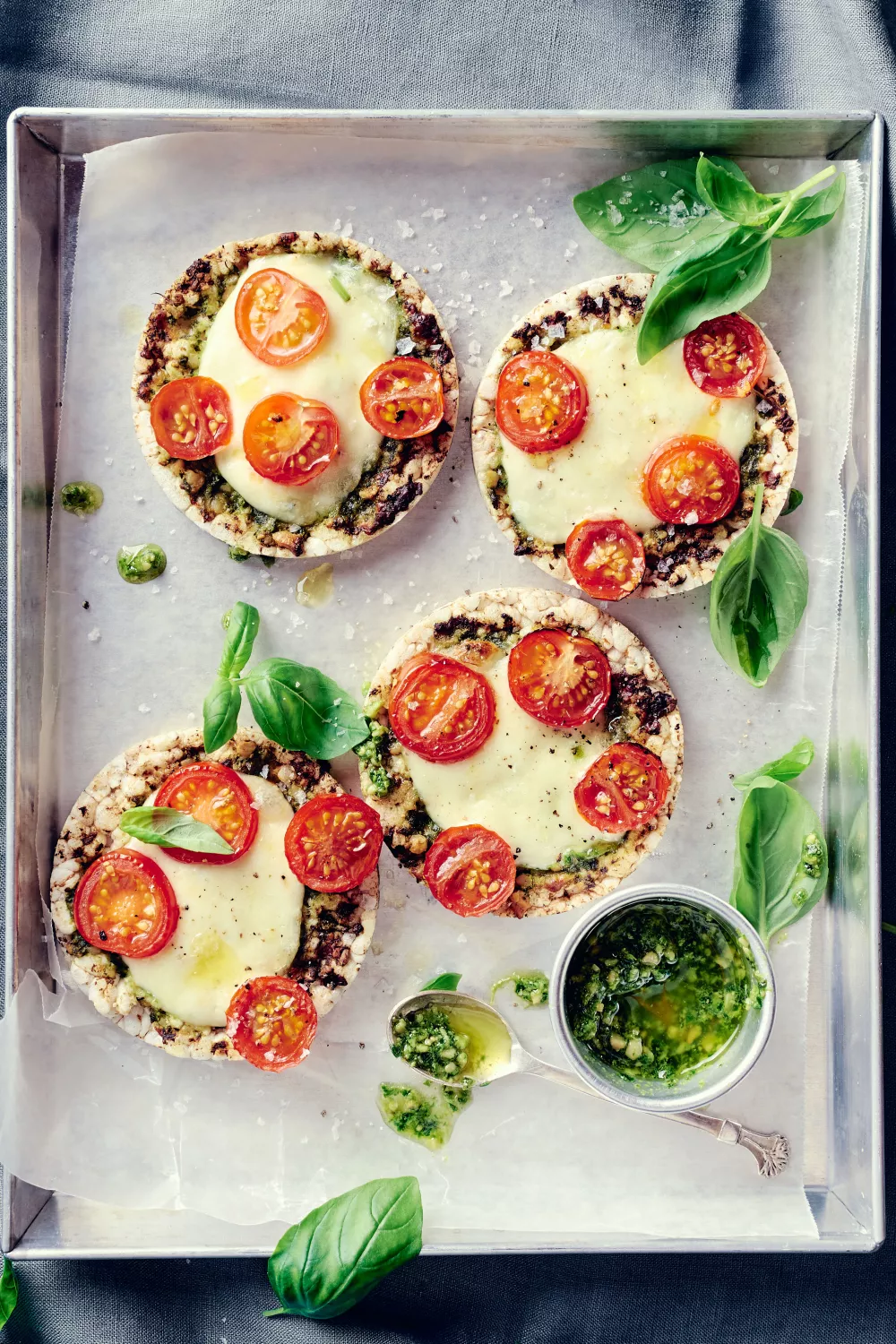 Besmeer de rijstwafels met de pesto en beleg ze met de mozzarella en tomaat. Leg de rijstwafels op de bakplaat en bak ze ongeveer 10 minuten in de oven, tot de mozzarella is gesmolten.