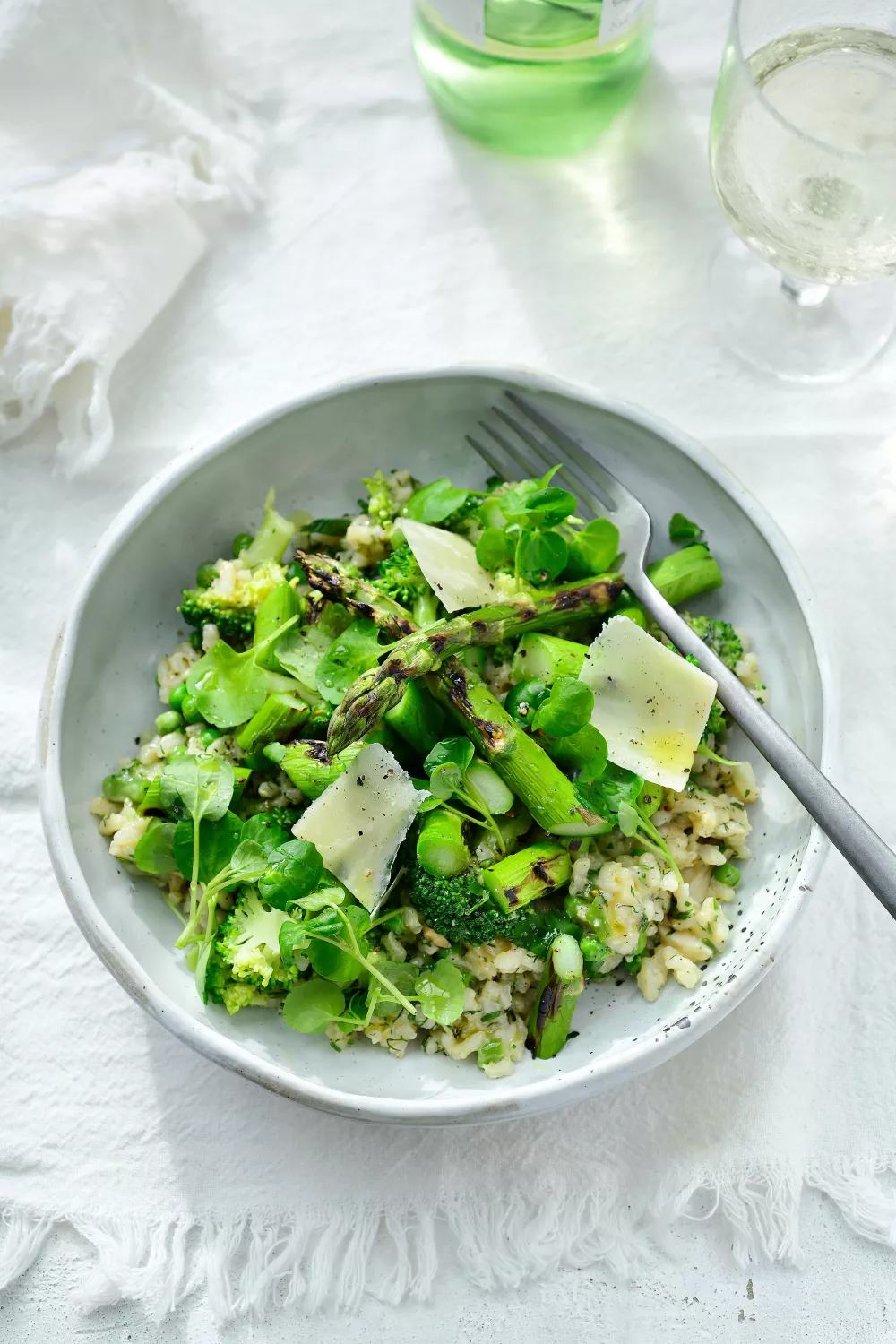 Risotto in ’t groen met erwten, broccoli en gegrilde asperges