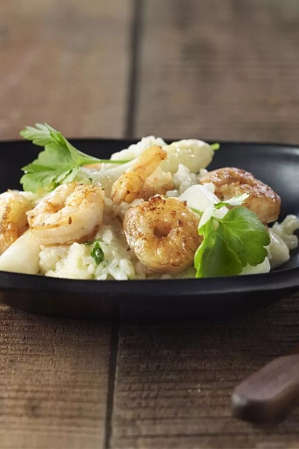 Verdeel de risotto over diepe borden en leg er telkens 5 scampi’s op. Werk af met takjes peterselie en wat zwarte peper.