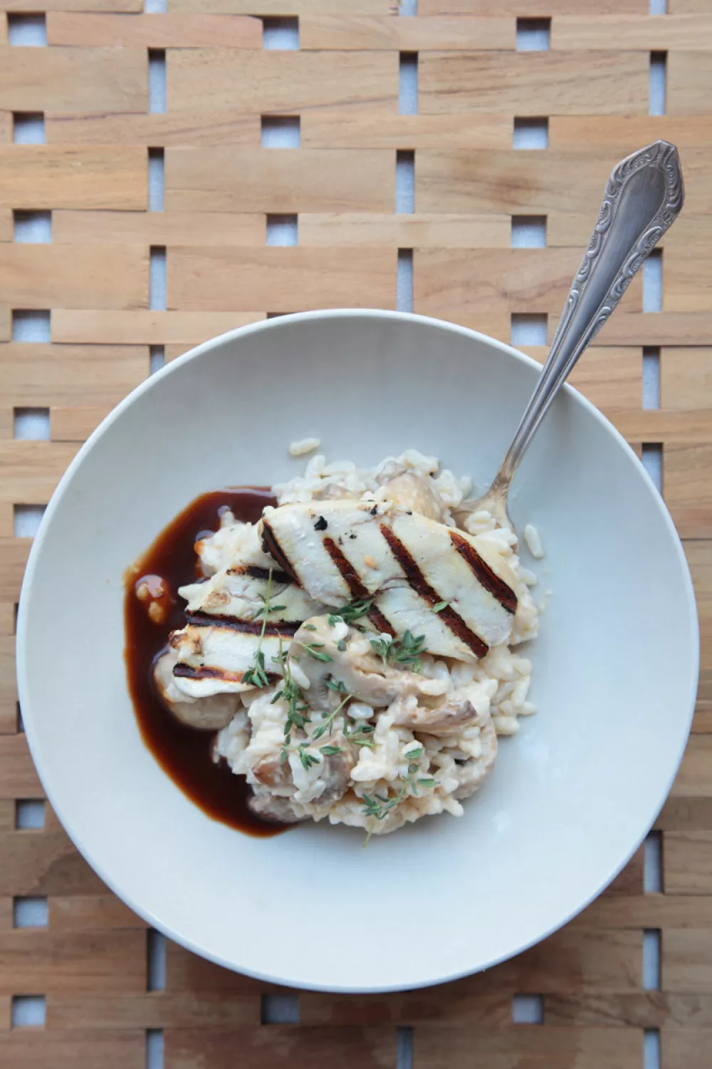 Schep de risotto in een diep bord. Leg de kipfilet en het takje tijm erop. Werk eventueel af met wat demi-glace saus.