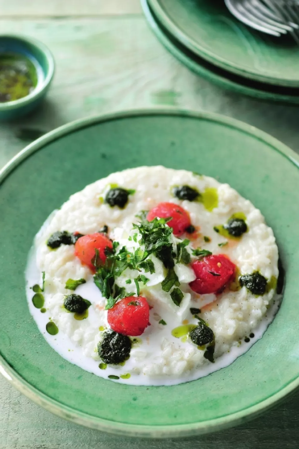 Romige risotto met zachte burrata, zoete pruimtomaatjes en zelfgemaakte basilicumpesto brengt Italiaanse smaken samen met een frisse toets van basilicum. De rijst wordt langzaam gegaard in een hartige vleesbouillon en de tomaatjes worden kort gepocheerd en gestoofd voor extra diepte. Ideaal voor een zomers diner of een sfeervolle avond, afgewerkt met krokant gebakken basilicum en puntjes pesto.