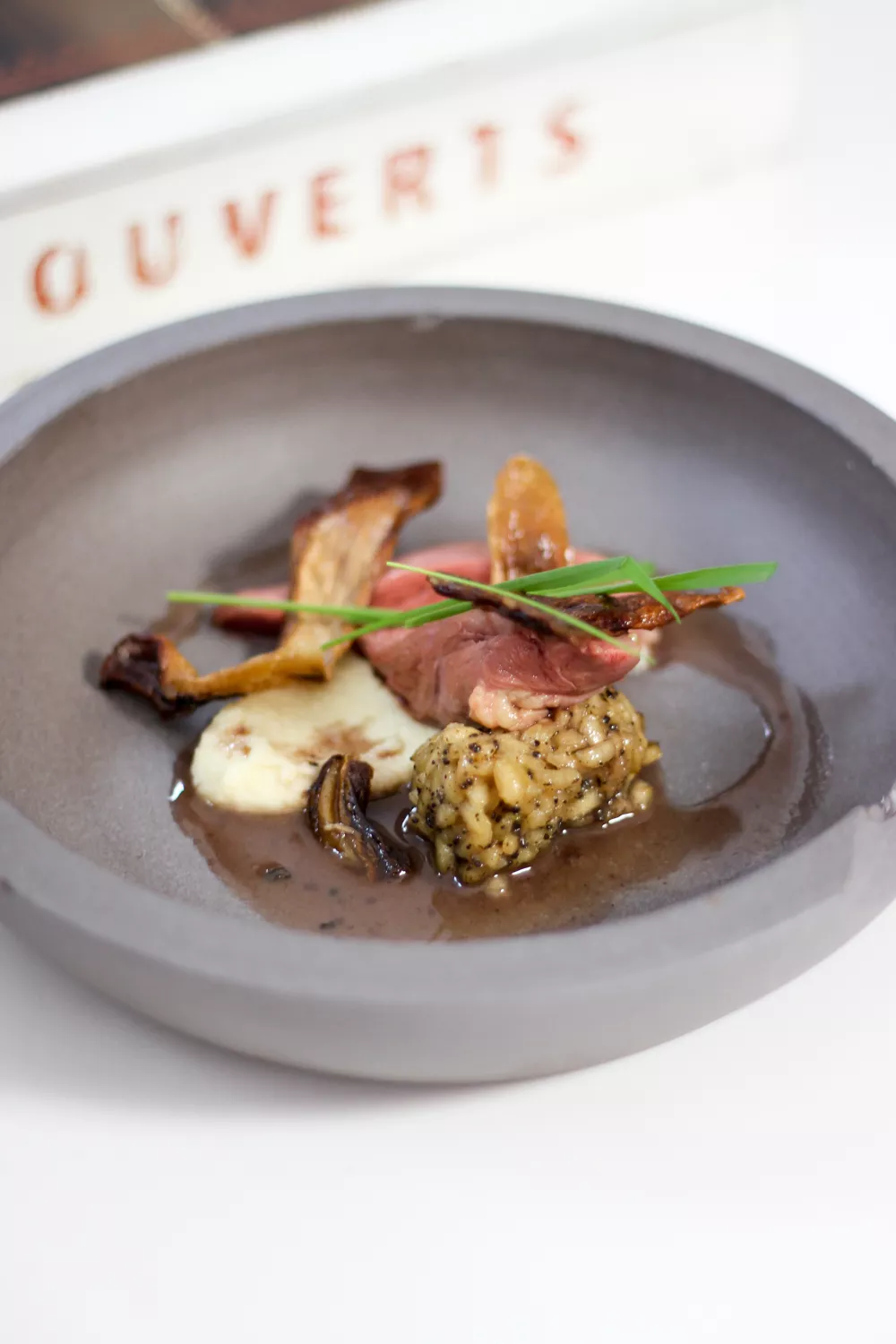 Dresseer de crème van peterseliewortel, de risotto, de stukjes duif en enkele lepeltjes van de saus mooi in een bord. Werk af met de gebakken champignons.