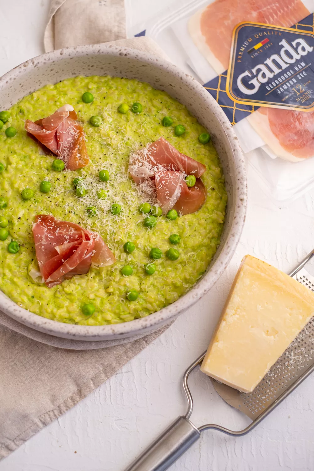 Romige risotto met erwtjes en krokante Ganda Ham combineert lenteverse smaken met Italiaanse comfortfood. Door een deel van de erwtjes met wat basilicum en kookvocht te blenden en de bouillon beetje bij beetje aan de rijst toe te voegen ontstaat een fluweelzachte textuur dankzij mascarpone en Parmezaanse kaas. Perfect voor een elegant doordeweeks diner of een lichte lentelunch.