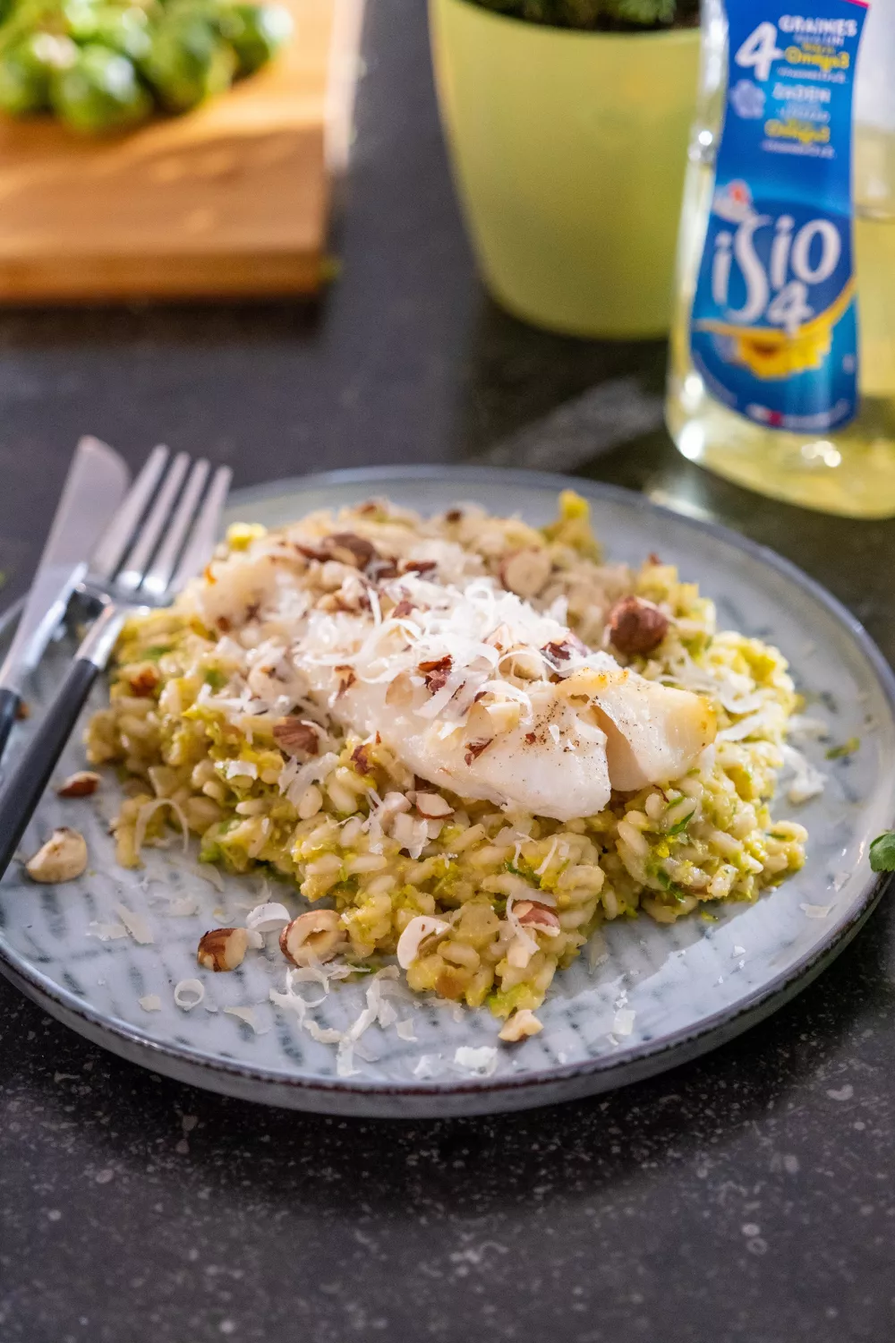 Romige risotto met kabeljauw en geroosterde spruitjes brengt zachte Parmezaanse rijst samen met licht bittere kool en knapperige hazelnoten. De risotto wordt op het fornuis gekookt, gestoofde spruitjes pureer je met mosterd tot een romige saus en de vis bak je kort in de oven voor een malse finish. Perfect voor een herfstig of feestelijk diner boordevol comfort en textuur.