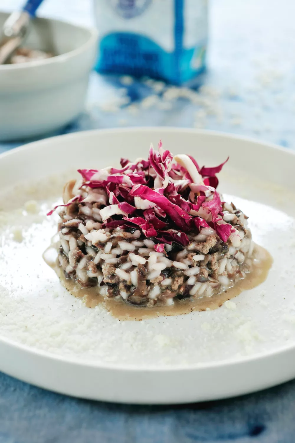 Romige risotto met bittere radicchio en kruidige Italiaanse venkelworstjes brengt scherpe en hartige smaken samen, afgewerkt met rode wijn en Parmezaan voor extra diepte. Met de klassieke risottotechniek van kort meestoven, blussen met wijn en geleidelijk bouillon toevoegen krijgt de rijst een fluweelzachte textuur. Perfect als hartverwarmend herfst- of weekendavondmaal en eenvoudig feestelijk te serveren met een dresseerring.