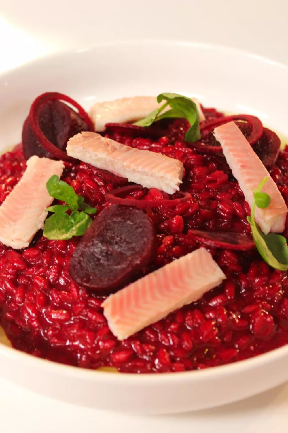 Een fluweelzachte risotto van arboriorijst en verwarmd bietensap brengt de aardse smaak van rode biet samen met gerookte forel tot een elegant herfstig gerecht. De ingekookte wijnsiroop, Parmezaan en boter geven diepe smaak en glans, met een pittige toets van mierikswortelpasta; de risottomethode en dunne plakjes rauwe biet zorgen voor textuur en frisheid. Perfect voor een sfeervol diner met vrienden of als bijzonder seizoensgerecht.