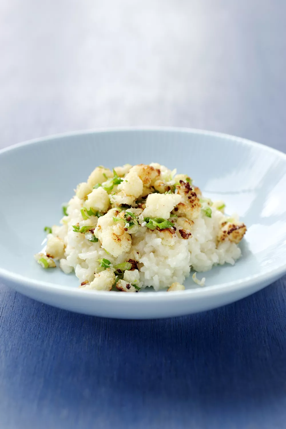 Verdeel de bloemkoolrisotto over de borden en schep er telkens wat geroosterde bloemkool op.