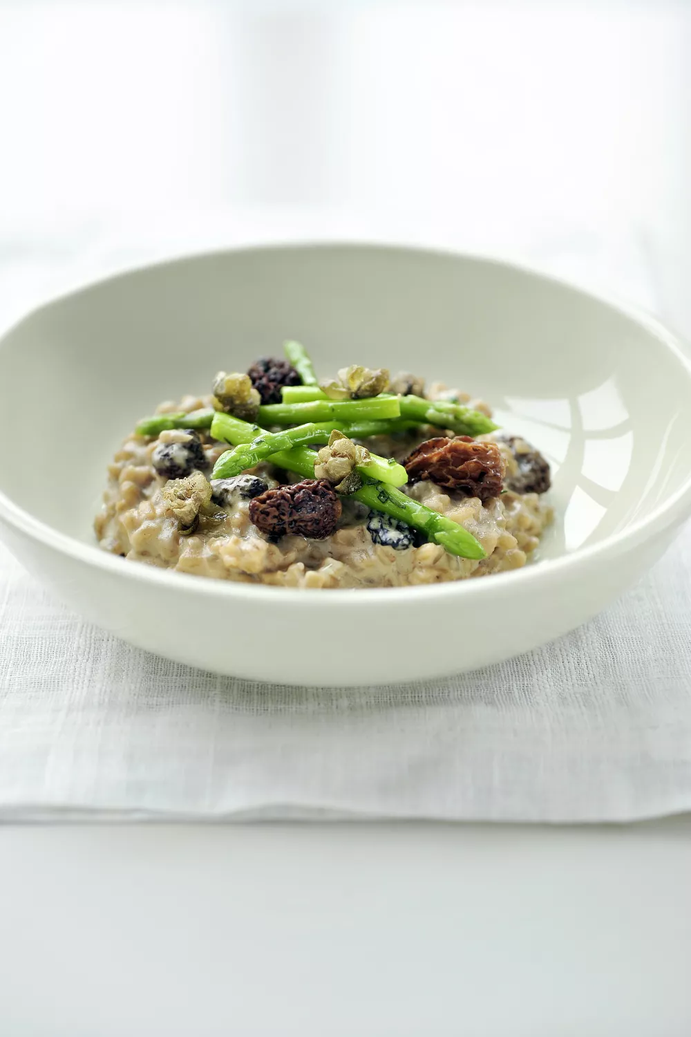Verdeel de risotto over de borden en schik er de morieljes en de aspergepunten op, werk af met de gefruite kappertjes en enkele druppels notenolie.