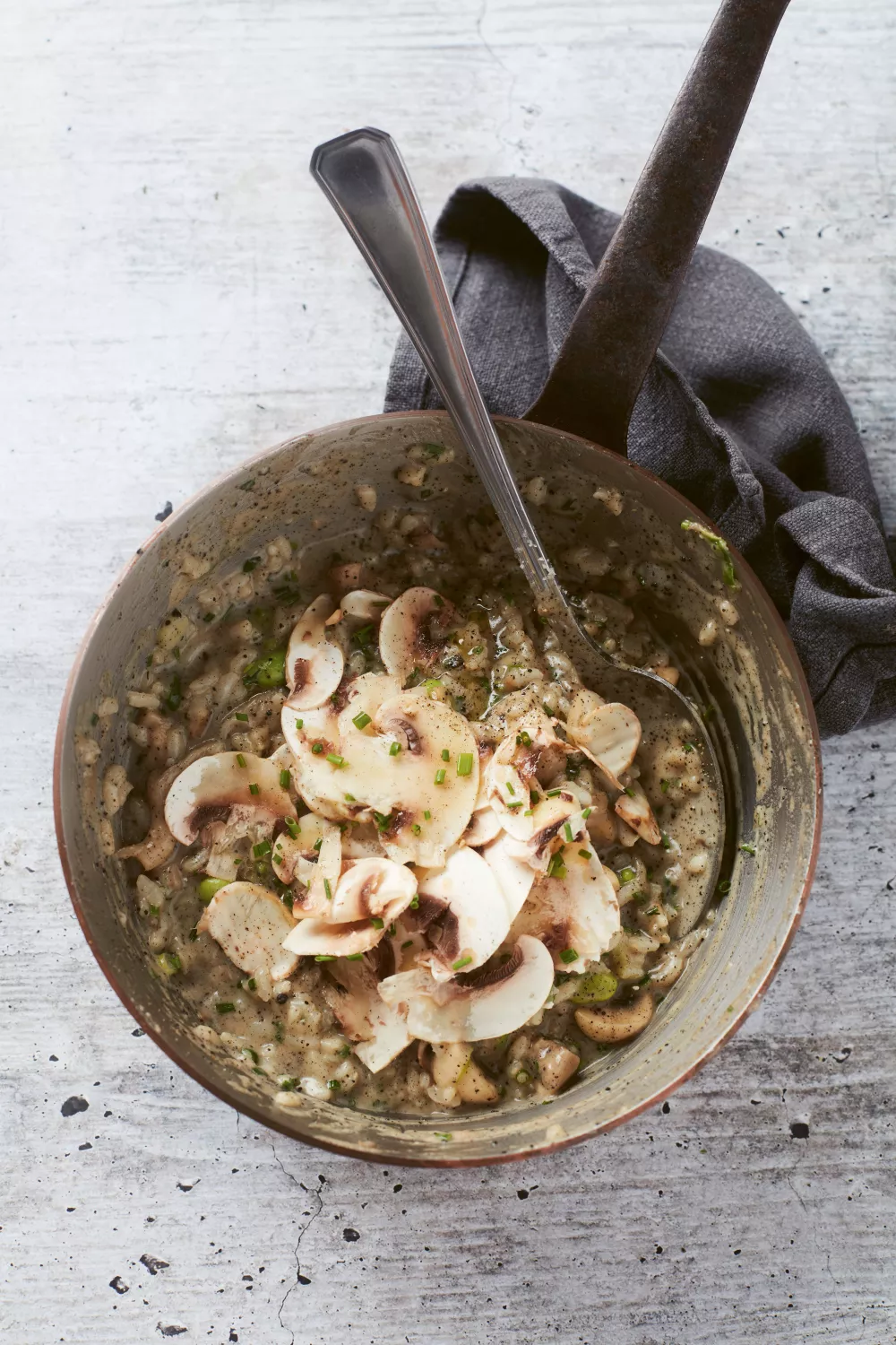 Romige truffelrisotto met een mix van knapperig aangebraden champignons en geraspte Parmezaan, perfect voor een feestelijk diner of een gezellige herfst of winteravond. De risottorijst wordt zachtjes geroerd en stapsgewijs gegaard met witte wijn en krachtige groentebouillon, waarna truffelpasta en kaas de smaken verdiepen. Werk af met lenteui, bieslook en geschaafde rauwe champignons voor frisheid en extra textuur.