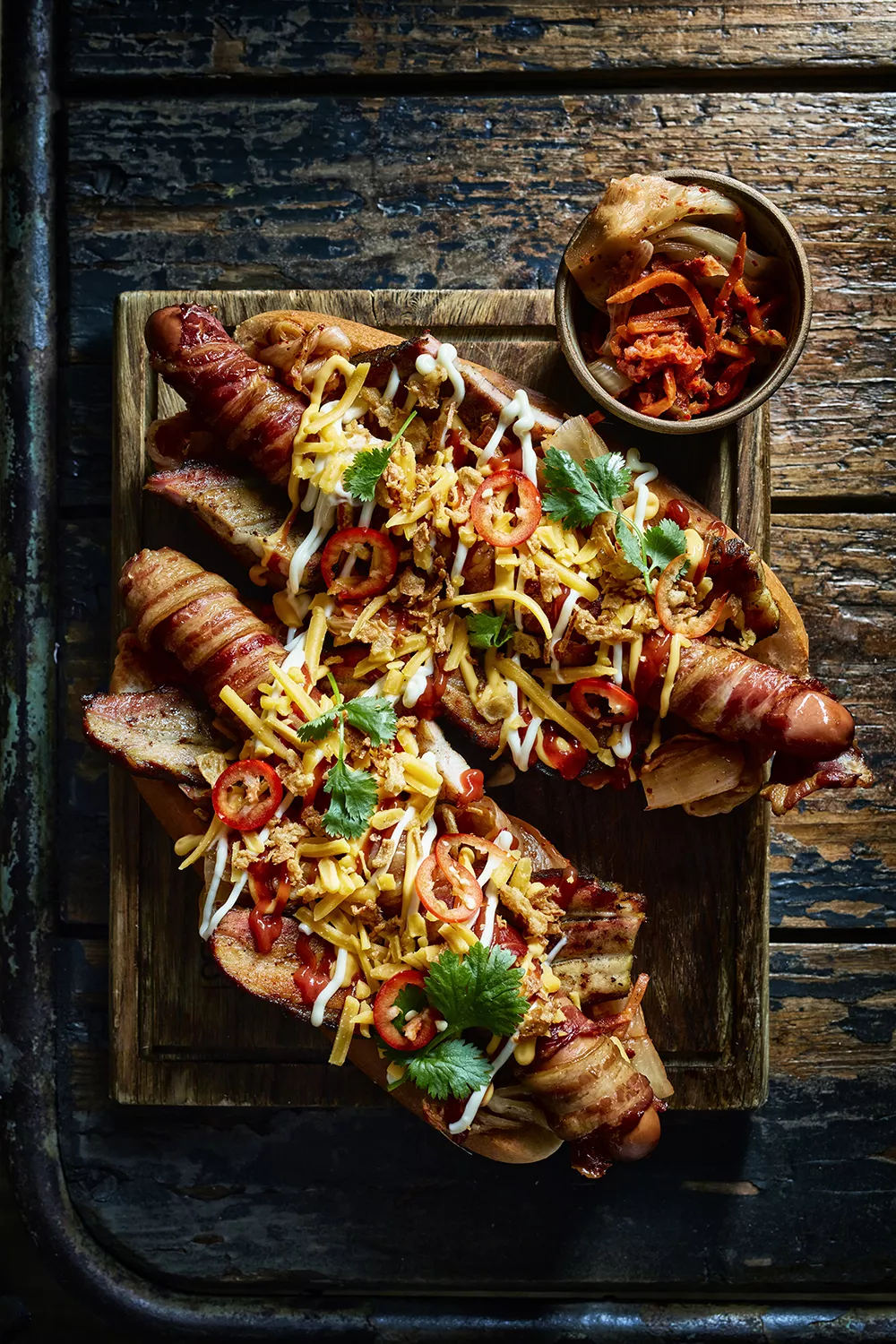 Verwarm de nacho cheese style dip in een pannetje. Snijd de hot dog buns open en toast ze eventueel kort op de warme BBQ. Leg op iedere bun wat kimchi en plakken gerookt buikspek. Leg de krokant uitgebakken bacondogs erbovenop en garneer met houtskoolketchup, limoenmayonaise, geraspte cheddar, gebakken uitjes, rode peperringen en wat koriander.