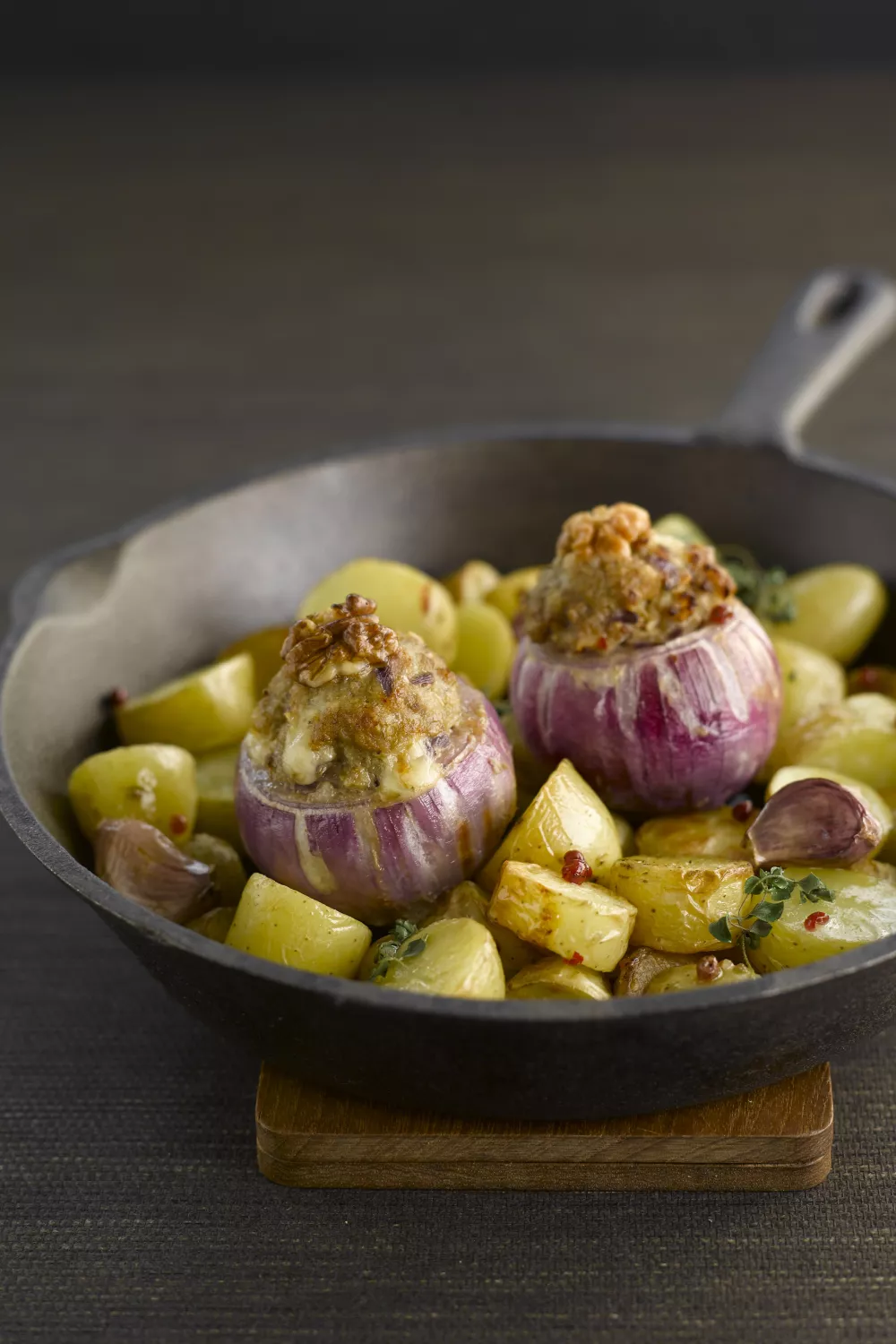 Deze hartige ovenschotel zet gevulde rode uien met walnootvulling centraal, naast goudbruin geroosterde krielaardappelen en knoflook. Uien uithollen, kort aanbakken en daarna de oven in met smeuïg gehakt, brandnetelkaas, walnoten, sambal en oregano, afgerond met roze peper. Perfect voor een herfstige doordeweekse maaltijd of als feestelijk bijgerecht.