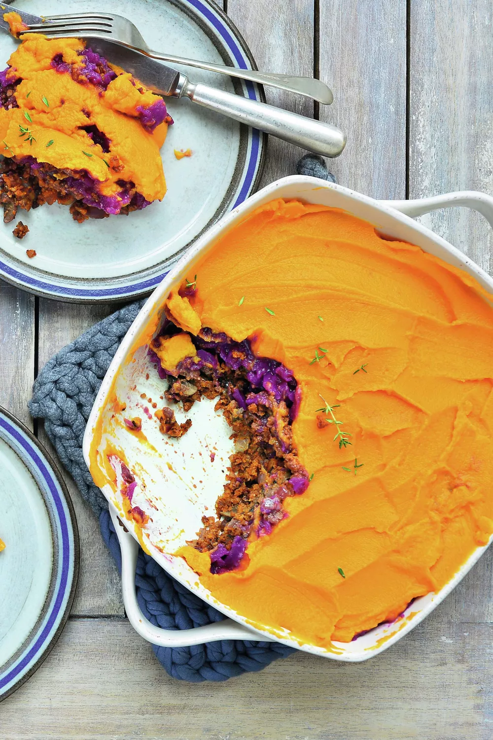 Een kleurrijke ovenschotel met gestoofde rodekool, hartige tempeh en romige zoete aardappelpuree die perfect past bij herfstige diners of een stevige doordeweekse maaltijd. De rodekool wordt zacht gestoofd met appel, laurier en kaneel terwijl de tempeh krokant wordt gebakken en samen met gebakken champignons een vullende laag vormt. Afgewerkt onder de grill voor een goudbruine puree en een knapperige textuur.