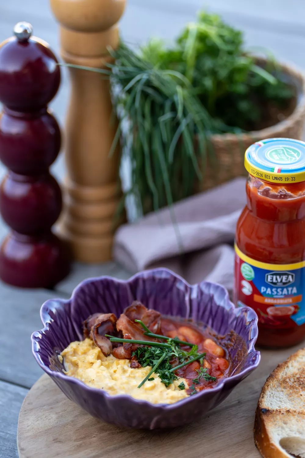 Een hartig, verwarmend bord: smeuïg roerei met krokant spek, pittige cannellinibonen in passata arrabbiata en goudbruin zuurdesembrood. Je fruit sjalot, rode ui en knoflook, laat de tomatensaus met cannellini zachtjes pruttelen en bakt spek en toast krokant op de plancha of in de pan. Ideaal voor een stevige brunch, weekendontbijt of als troostmaaltijd op koude dagen.