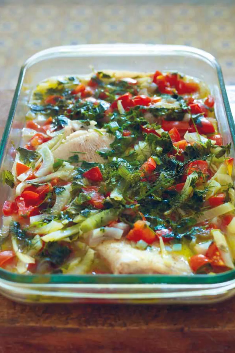 Leg de rog in een vuurvaste schotel. Kruid de vis met peper en zout. Voeg er de blokjes tomaat, gesnipperde sjalot en snippers venkel aan toe. Snij de koriander en strooi die over de rog. Een fijngesnipperd teentje knoflook mag er ook bij. Overgiet alles met droge witte wijn en een scheut olijfolie. Dek de schotel af met aluminiumfolie en laat de vis pocheren in een voorverwarmde oven op 180 °C tot hij gaar is (ongeveer een halfuurtje).