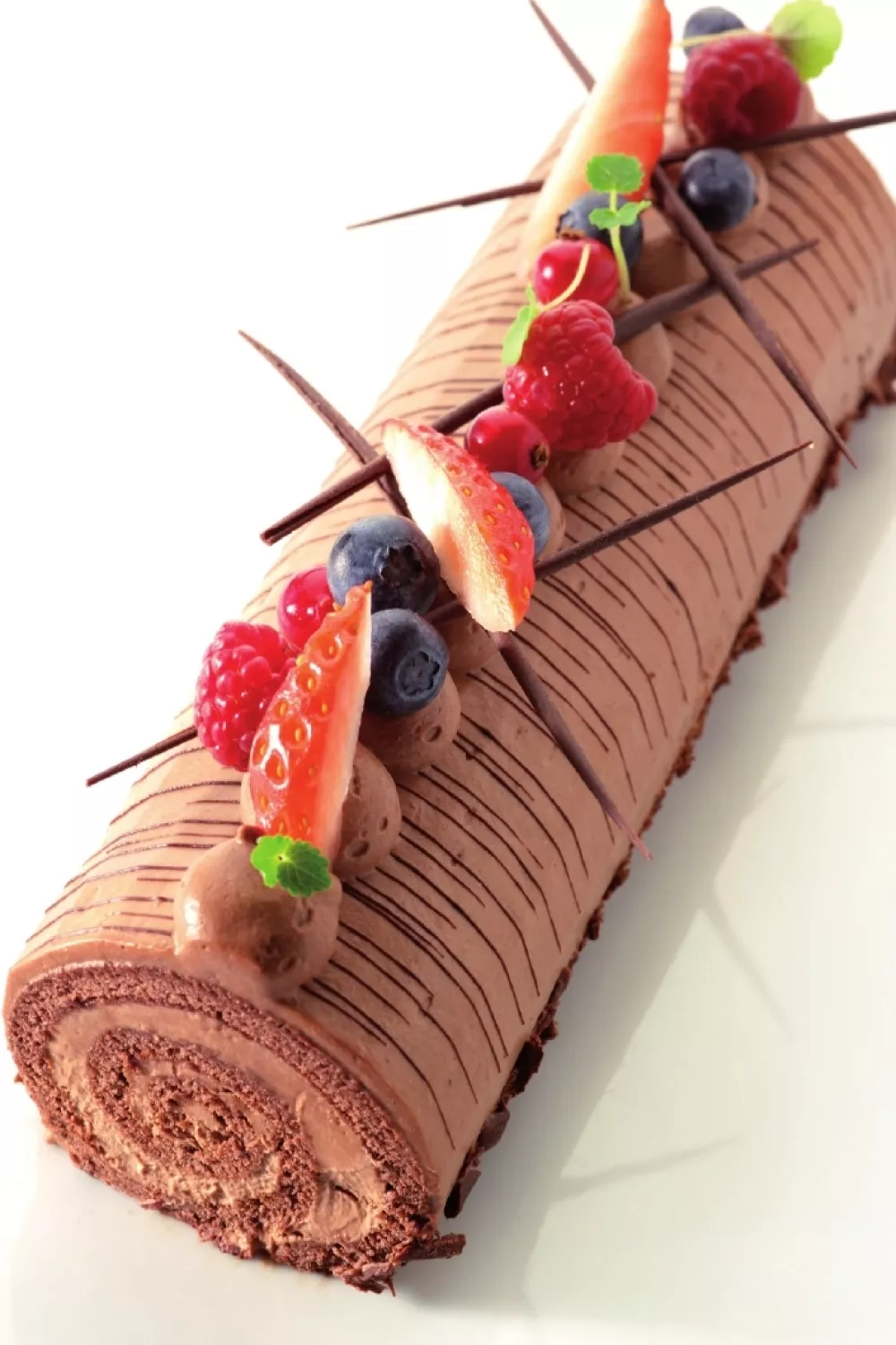 Luchtige rolbiscuit met een fluweelzachte chocolademousse van pure chocolade, room en eieren vormt een feestelijk dessert voor speciale gelegenheden. De dunne cacaobiscuit wordt kort gebakken, meteen opgerold en weer uitgerold om te vullen met mousse die dankzij gelatine en 24 uur koelen stevig en romig wordt. Werk af met gesmolten chocolade, rood fruit en verse munt voor een elegante presentatie bij herfst- en winterdiners of feestjes.