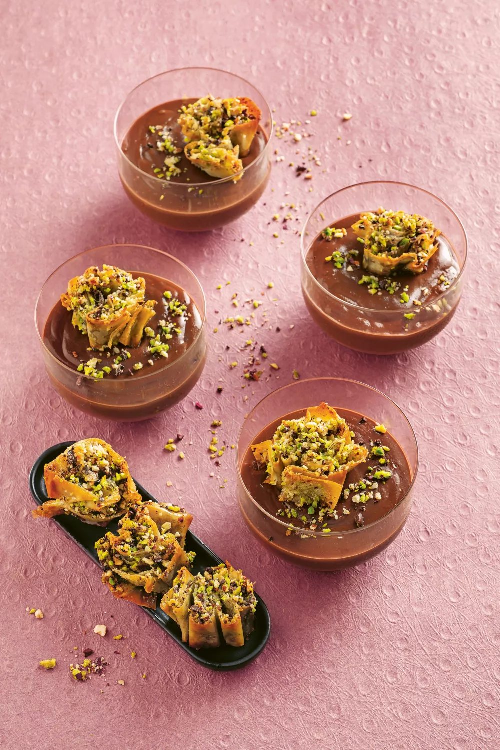 Romige chocoladepudding met pure chocolade en cacaopoeder, gecombineerd met krokante baklavaroosjes van filodeeg gevuld met gehakte pistachenoten en amandelen. Dit feestelijke dessert brengt het zachte, gekoelde karakter van gestremde pudding samen met warm gebakken filodeeg en een honingcitroen siroop, door roeren, eieren temperen, bakken en koelen. Ideaal als wintertoetje of voor een gezellig diner met vrienden.