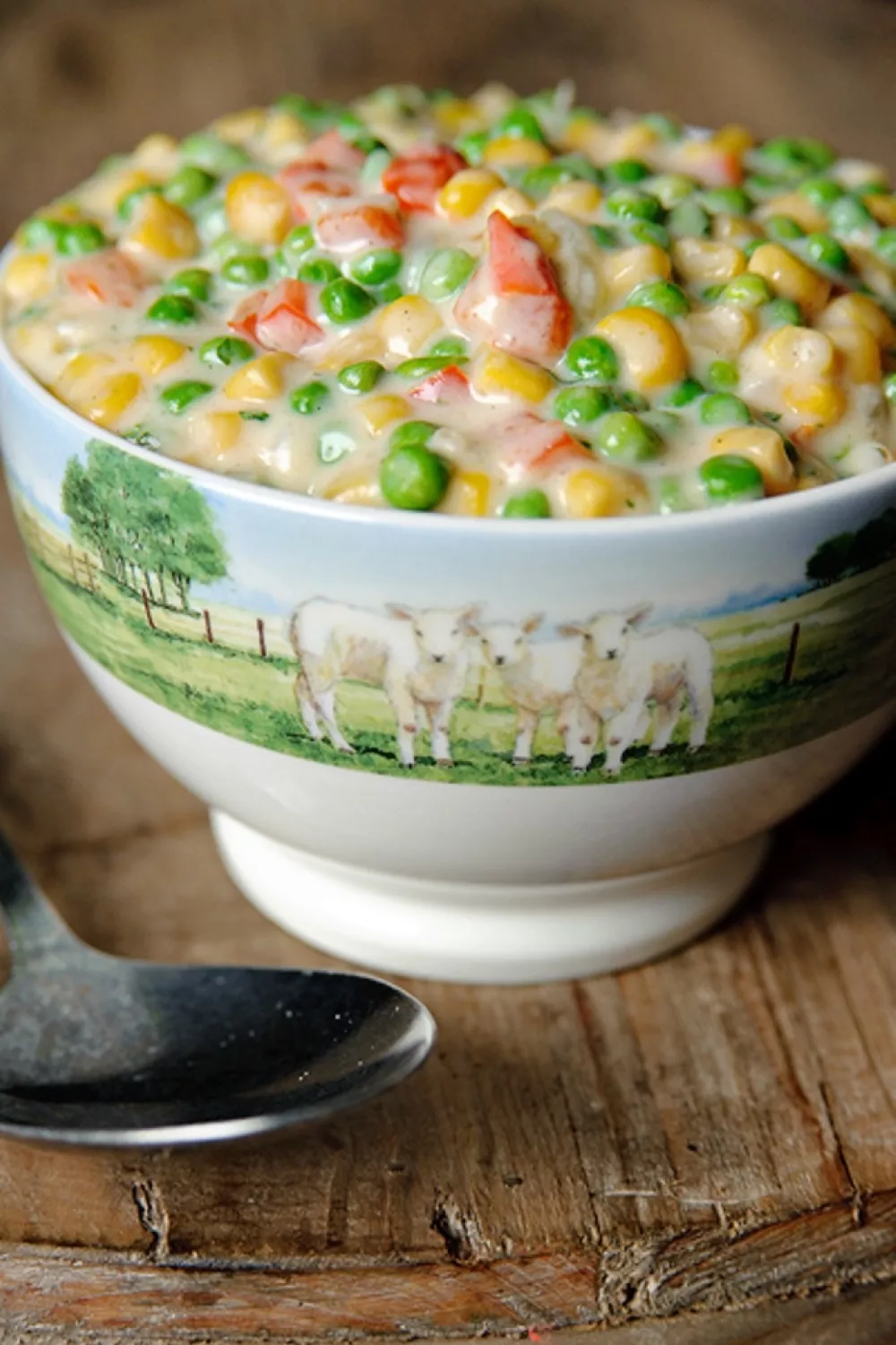 Romige doperwten met maïs waarin gesmoorde sjalot en rode paprika de frisse basis vormen voor een zachte roux met melk en geraspte Parmezaanse kaas. Het milde, hartige gerecht krijgt door een vleugje nootmuskaat diepte en werkt perfect als snelle pastasaus voor doordeweekse diners of als smaakvolle ovenschotel met aardappelpuree. Licht, troostrijk en ideaal in lente en zomer wanneer verse groenten volop verkrijgbaar zijn.