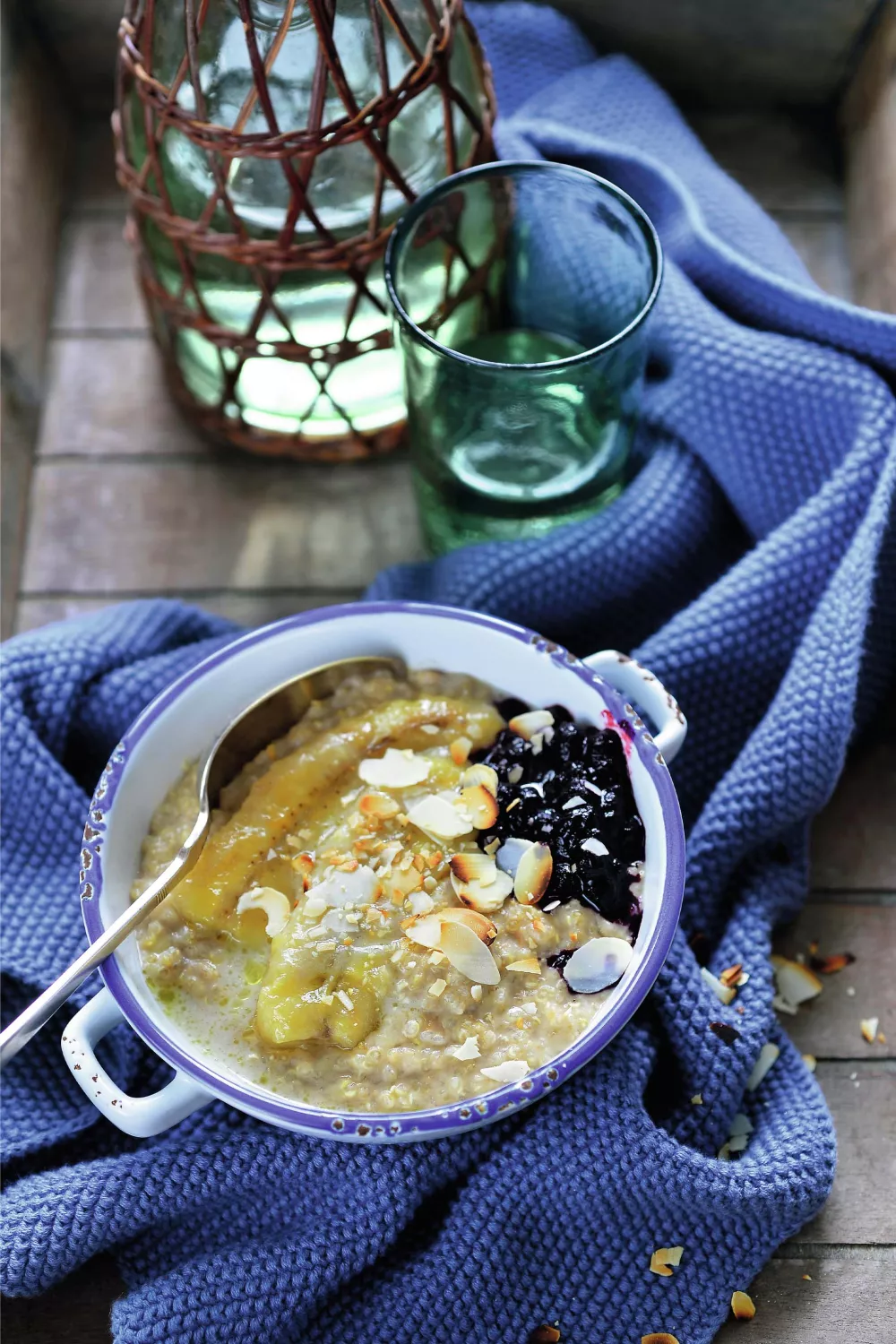 Romige quinoapap met in kokos gebakken banaan combineert zachte quinoa en cashewmelk met karamelachtige banaan, notenpasta en een vleugje vanille, ideaal voor een verwarmend ontbijt of weekendbrunch. Door zacht sudderen, kort bakken van de bananen en een warme blauwe bessensaus met ahornsiroop zet je snel een voedzaam vegan gerecht op tafel. Werk af met geroosterde amandelschilfers voor een knapperige toets.