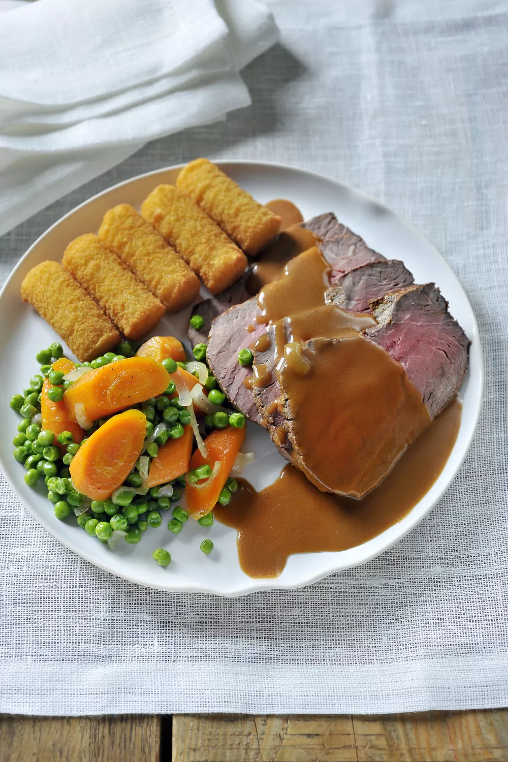 Malse rosbief met doperwtjes en fijne wortelringetjes in een diepe rode wijnsaus, geserveerd met krokant goudbruine kroketjes voor een klassieke hoofdschotel. Het vlees wordt krachtig aangebraden en kort in de oven gegaard, de groenten licht gestoofd en de saus ingekookt en gezeefd voor rijke smaken. Ideaal voor een feestelijk diner of een gezellige herfst en wintermaaltijd.