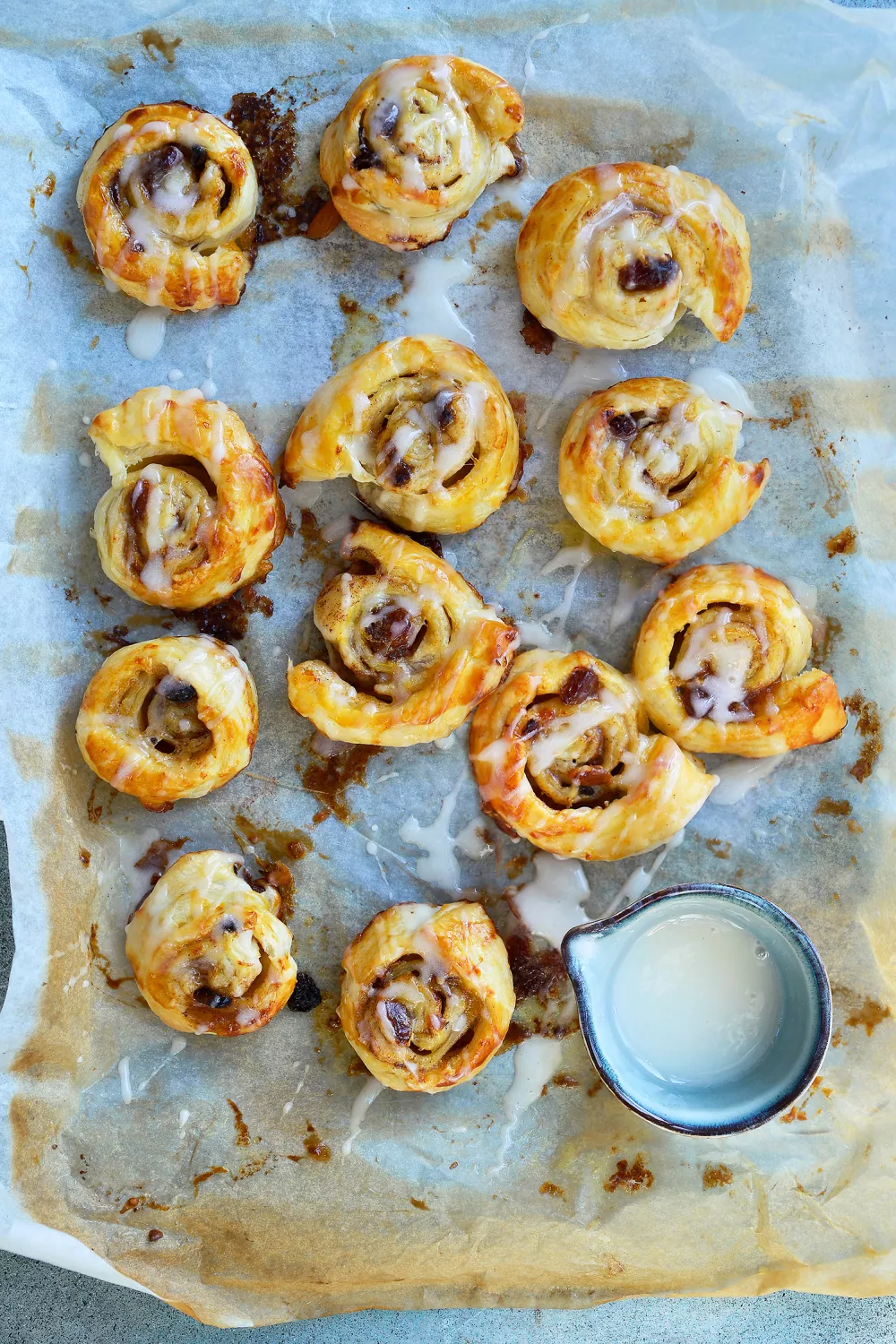 Rozijnen en kaneel in knapperig bladerdeeg vormen heerlijke koffiekoekjes die perfect passen bij een gezellige koffiepauze of brunch. Door het deeg op te rollen en in schijfjes te snijden en ze te bestrijken met bruine suiker, boter en warme abrikozenconfituur krijg je goudbruine randen en een zachte binnenkant, afgewerkt met fris citroenglazuur. Heerlijk als seizoensgebonden zoet gebak bij bezoek of een herfstig ontbijt.