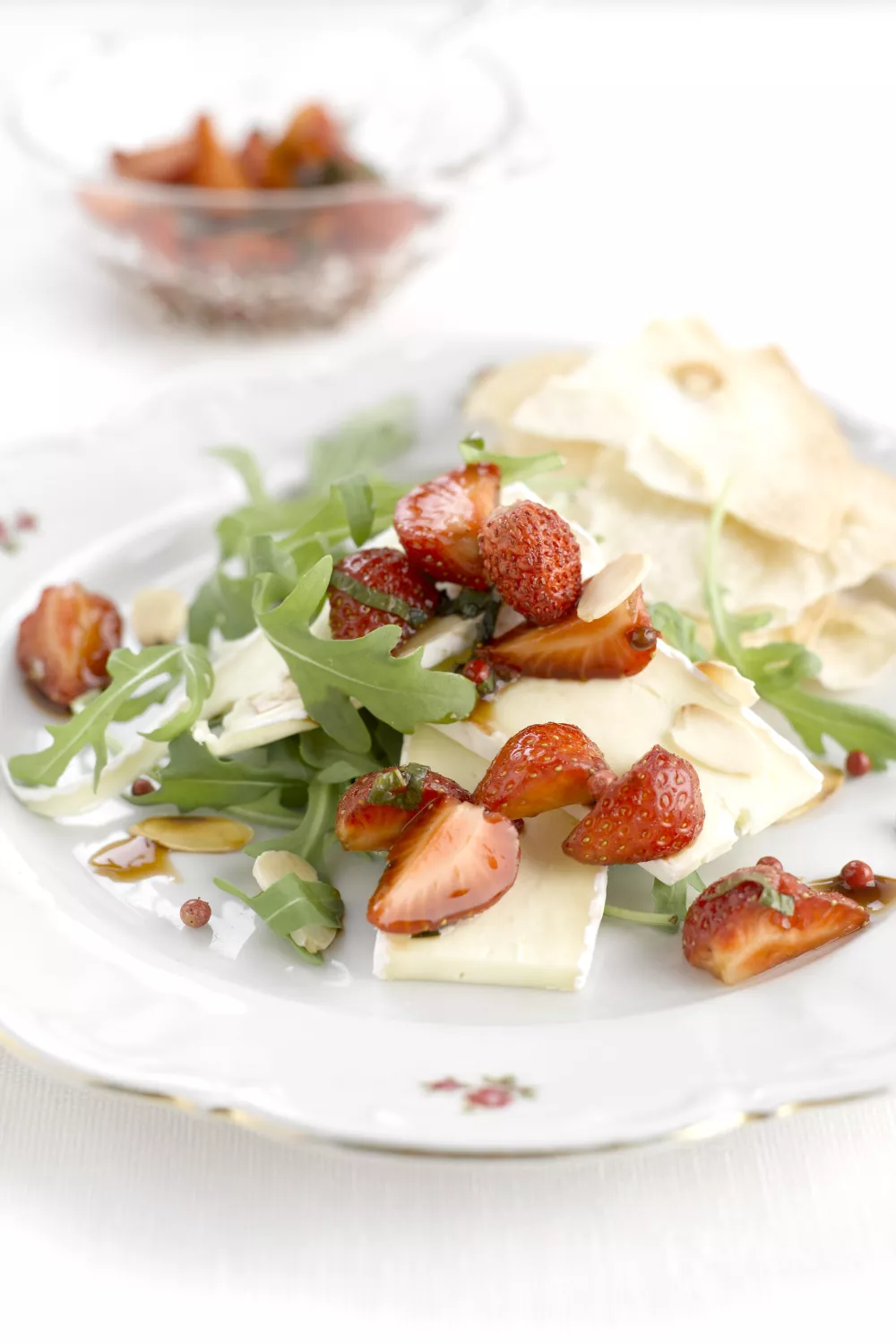 Deze frisse rucolasalade met romige brie en gemarineerde aardbeien combineert zoete honing en balsamico met een subtiele bite van roze peperbolletjes en verfrissende citroenmelisse. De aardbeien marineren een nacht zodat ze extra sap en smaak afgeven; die marinade wordt daarna opgeklopt met slaolie tot een glanzende dressing. Met geroosterde geschaafde amandelen als finishing touch is dit een zomerse, lichte maaltijd voor lunch, picknick of borrel.