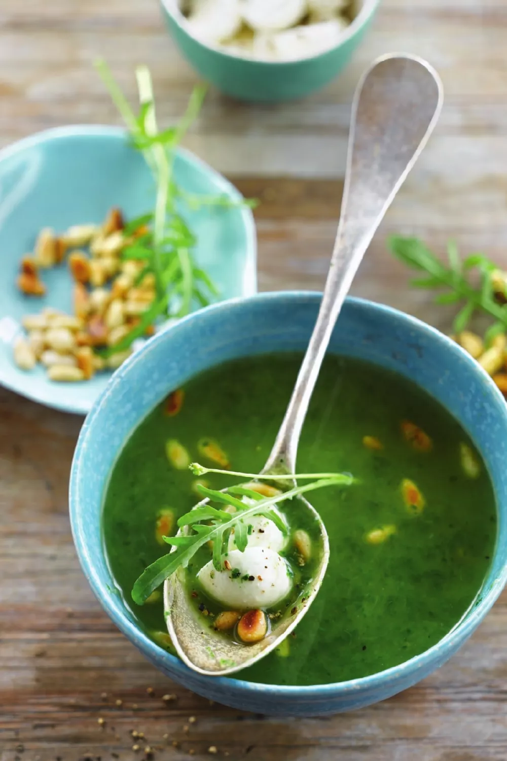 Schep de soep in kommen en werk af met mozzarellabolletjes en pijnboompitten. Serveer er eventueel verse rucola bij.
