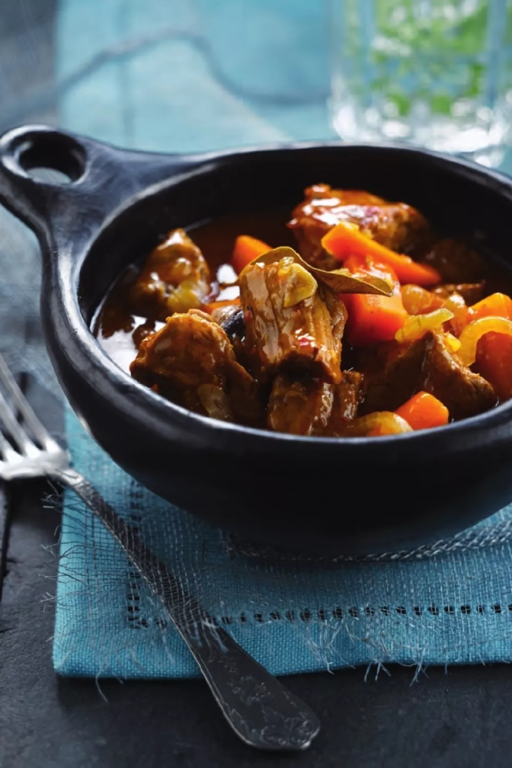 Dit runderstoofpotje met chili en rum combineert karamelliserende uien, pittige sambal en warme rum voor een diep, rond aroma. Het vlees wordt eerst goed aangebakken en daarna urenlang langzaam gestoofd met laurier, peperkorrels, kruidnagels en wortelen tot alles boterzacht is. Perfect als stevige wintermaaltijd of zondagse comfortfood voor een gezellige familieavond.