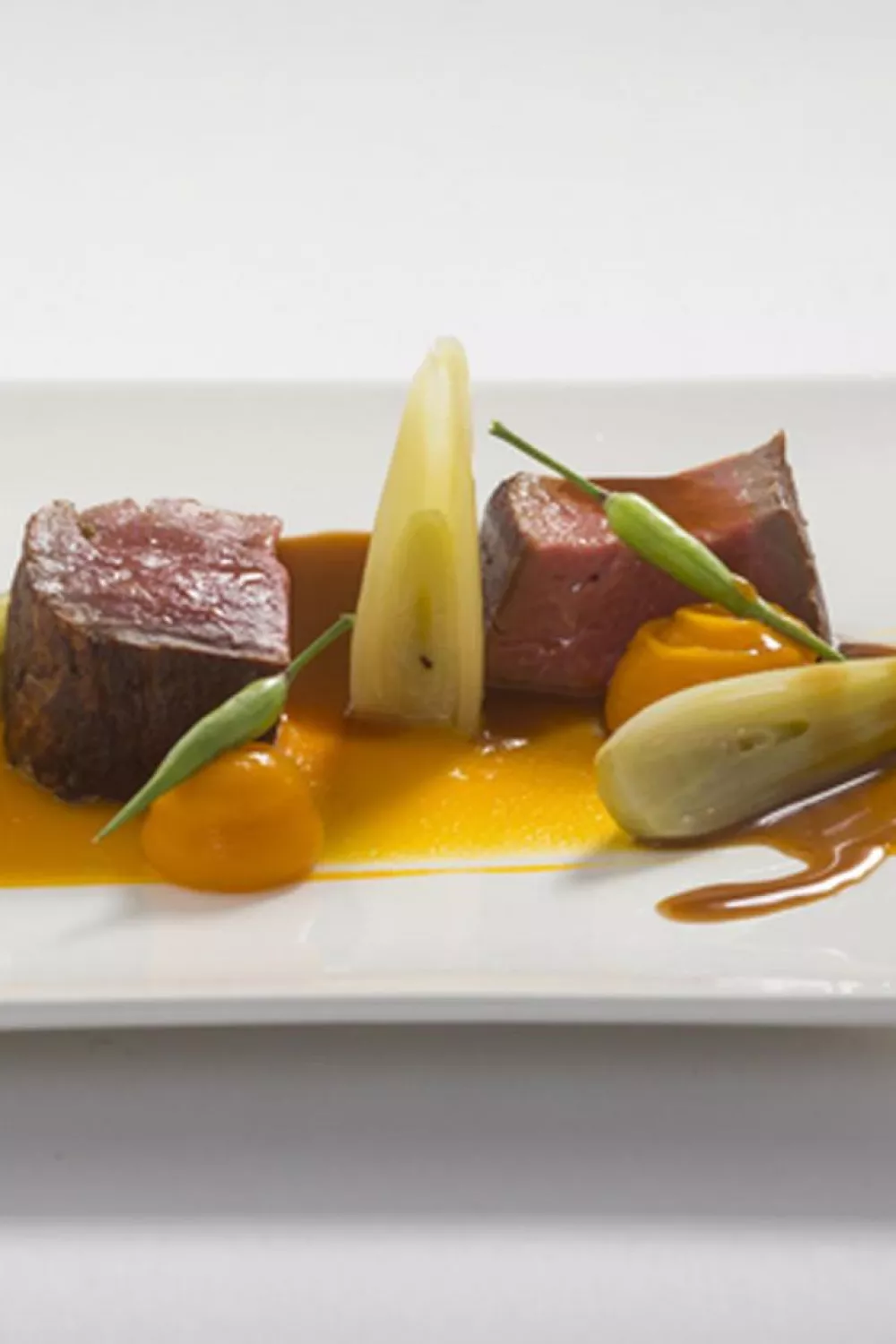 Kruid het vlees royaal met peper en zout en bak in 50 gram boter mooi bruin. Gaar nog enkele minuten in een oven van 160 graden. Laat het vlees nog 10 minuten rusten onder een zilverpapier. Smeer de zalf van pompoen uit met een spatel over het bord.