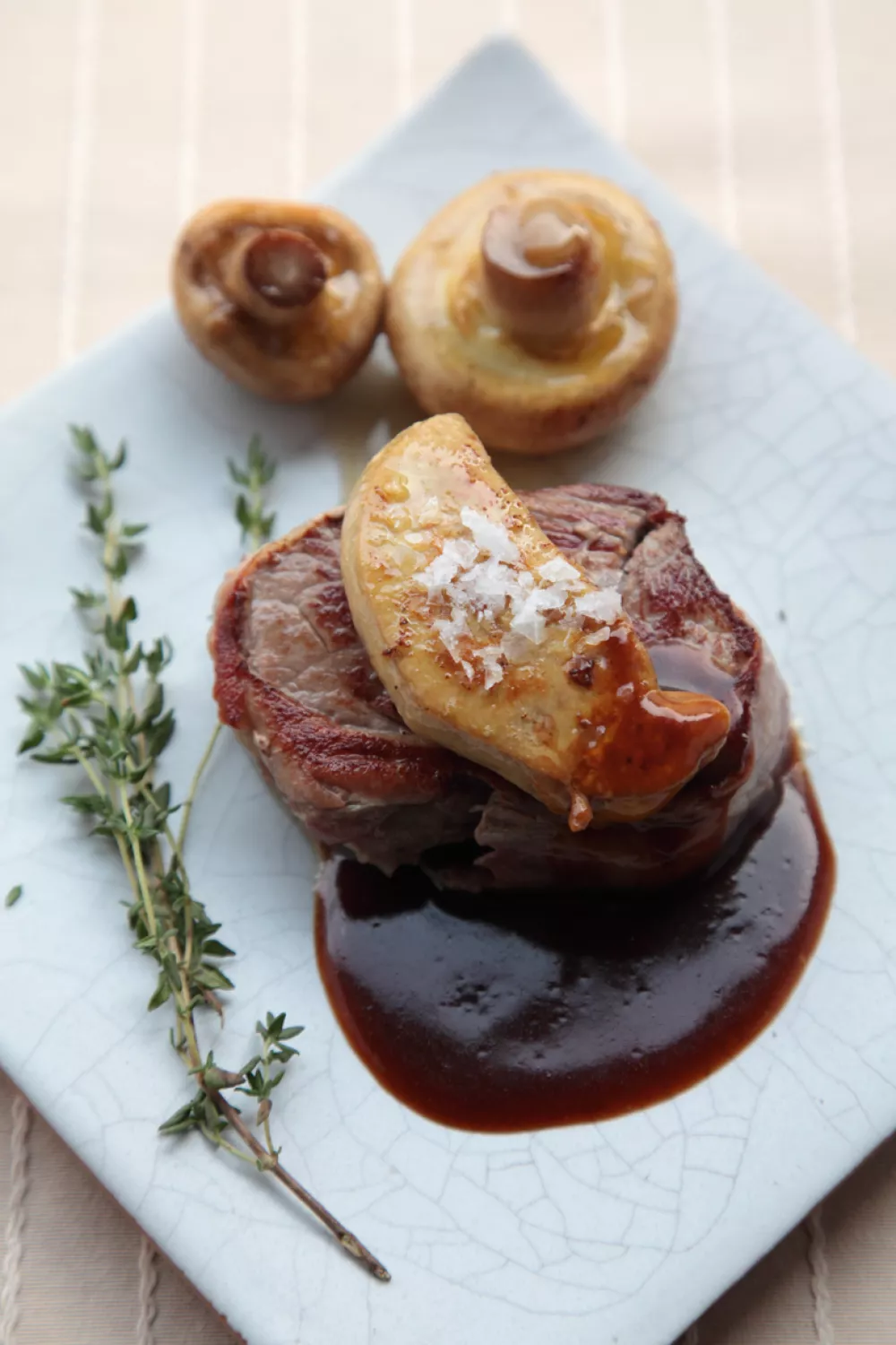 Dit feestelijke hoofdgerecht brengt malse rundtournedos en fluweelzachte eendenlever samen met een ingekookte rode wijnsaus op basis van demiglace, rietsuiker, kaneel en tijm. De biefstuk wordt kort aangebraden in olijfolie en boter, krijgt rust, en komt met gestoofde champignons op tafel. Perfect voor een winterse avond, een chic etentje of de feestdagen.