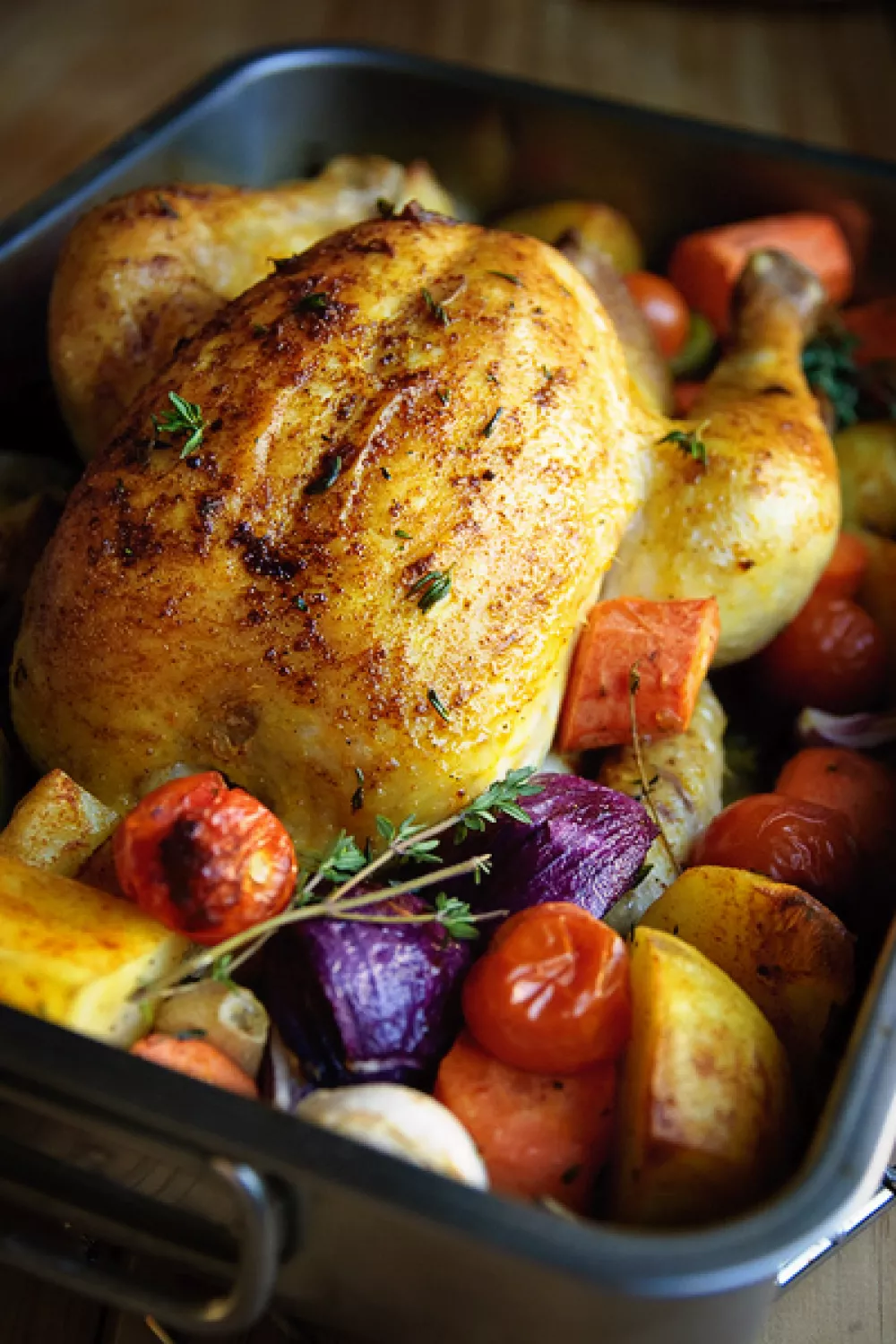 Rustiek geroosterde kip uit de oven, perfect voor een doordeweeks diner of de zondagse tafel. Een hele kip gevuld met citroen en tijm braadt op aardappel, wortel, paprika en rode ui, met knoflook en kerstomaatjes voor zoete, geroosterde smaken. Eenvoudig eenpansgerecht uit de braadslede waarbij je met braadvocht bedruipt voor sappig vlees en knapperige groenten, heerlijk comfortfood voor herfst en winter.