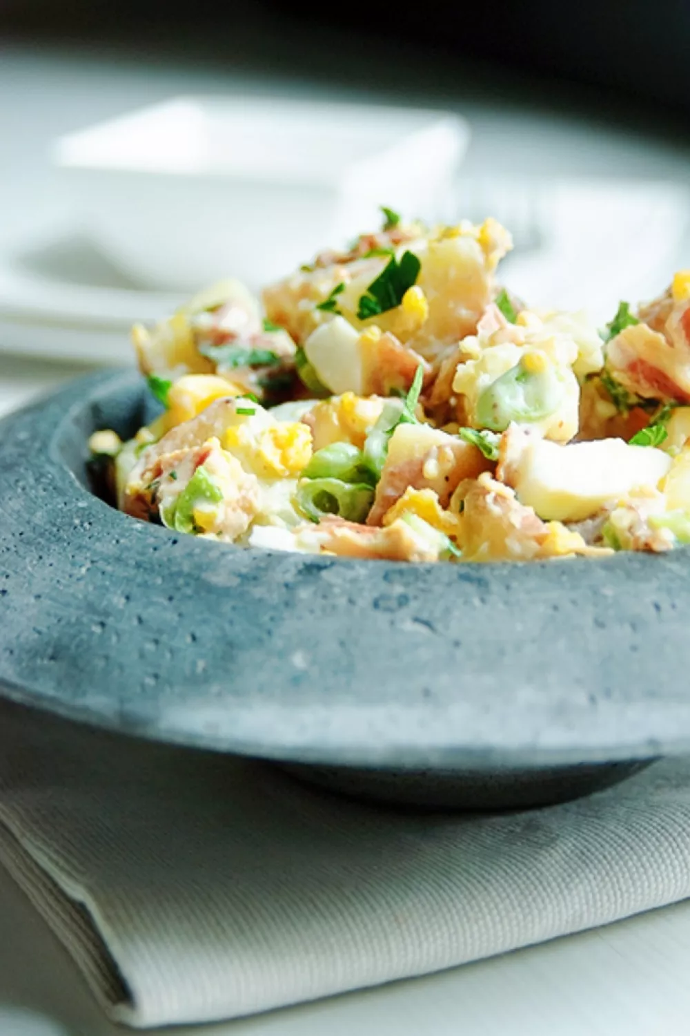 Deze rustieke aardappelsalade met gekookte Roseval aardappelen combineert een romige dressing van mayonaise en yoghurt met grove mosterd en een klein scheutje honing. Krokant gebakken spek, fijngehakte hardgekookte eieren en frisse lente-ui zorgen voor hartige textuur en smaak. Lekker als zomers bijgerecht bij de barbecue of gemakkelijk mee te nemen naar een picknick.