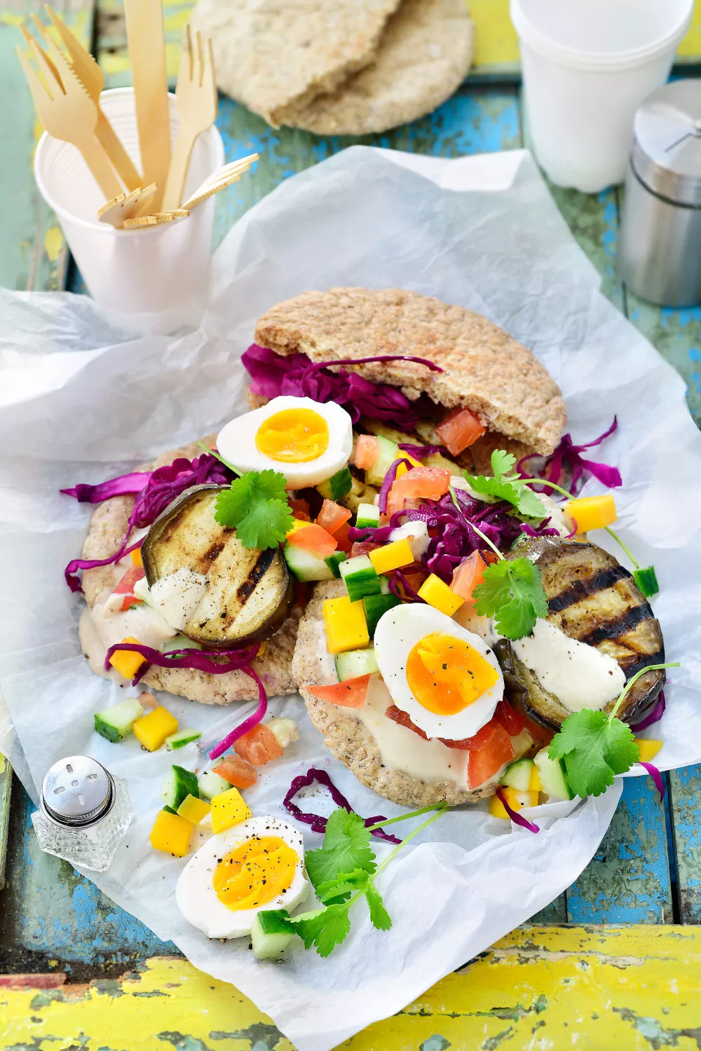 Rooster de pitabroodjes in een broodrooster, snijd ze open of leg ze als toast op een bord. Bestrijk de broodjes met de tahinisaus en vul ze daarna op met de groente mengeling, de rode kool, de aubergineschijven en de gekookte eitjes. Serveer met wat extra koriander en wat druppeltjes citroensap.