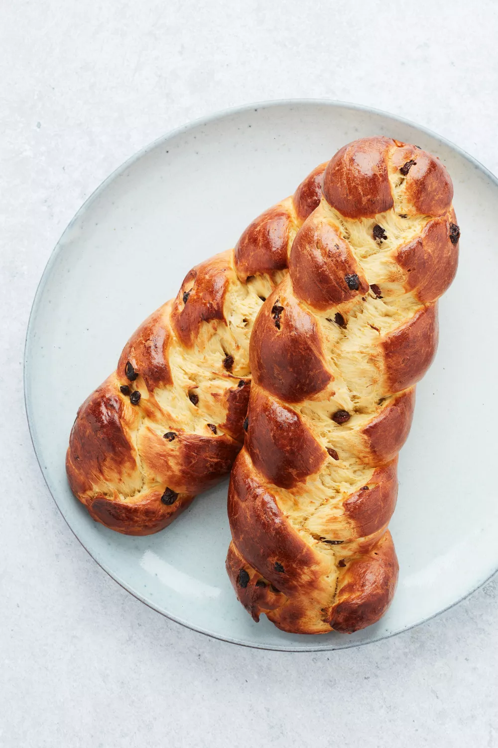 Begin met twee handen het deeg intensief te rekken door het uit te duwen met de handpalm en terug te vouwen. Herhaal dit gedurende 10 à 15 minuten of tot het niet meer aan de handen kleeft. Bol het op en laat 15 minuten afgedekt rijzen onder huishoudfolie of een vochtige keukenhanddoek. Druk het deeg plat om de lucht eruit te laten. Verwerk er de rozijnen en de zeste in. Bol op en verdeel het deeg in zes porties. Rol elk deegbolletje tot een worst. Maak één vlecht van drie worstjes. Leg deze op een met bakpapier beklede bakplaat. Dek af met een vochtige handdoek en laat rijzen tot het deeg in omvang verdubbeld is. Bestrijk met losgeklopt ei.