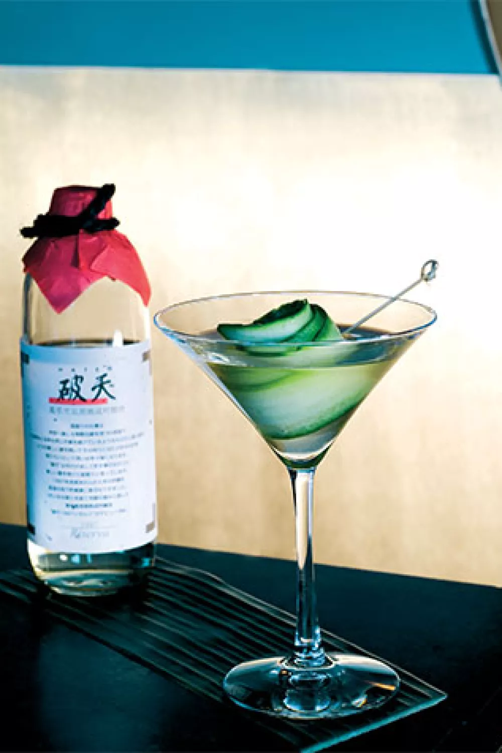 Koel het martiniglas voor met gepileerd ijs. Doe vervolgens de wodka, de sake, een plakje verse gember, een schijfje komkommer en de wasabi in een met ijsblokjes gevuld mixglas.