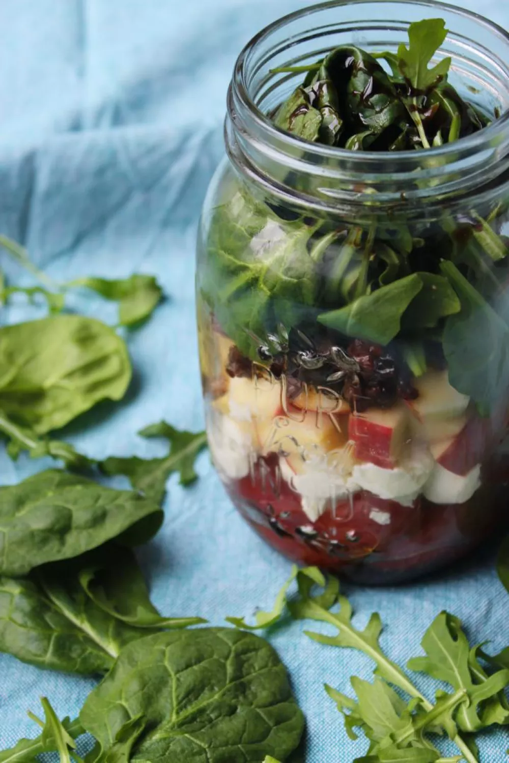 Knapperige spekblokjes en romige geitenkaas vormen de smaakmakers in deze kleurrijke salad jar met rucola en babyspinazie. Zoetzure balsamico met honing, kerstomaatjes en frisse appelblokjes zorgen voor een friszoete balans. Perfect als makkelijke lunch of lichte avondmaaltijd; bak de spekjes en bouw de jar laag voor laag.