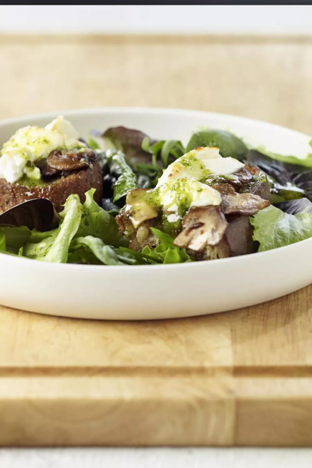 Stappenplan om recept “Salade geitenkaas met gemarineerde champignons en pesto” te bereiden